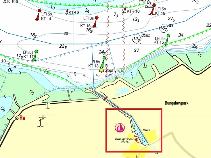 De toegang tot de havengeul (Coƶrdinaten: 51°35.688ā N en 004°00.224ā E en Maritieme kaart 1805.5) naar de haven Stavenisse situeert zich bij de groene boei KT 13.